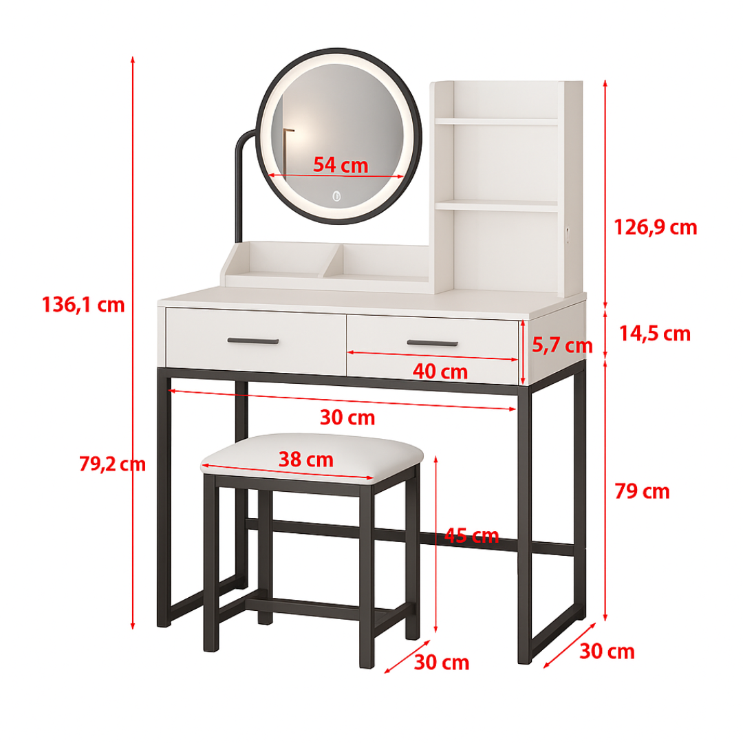 Az asztal rengeteg tárhelyet kínál – 2 tágas fiók, 3 nyitott polc és 2 szervező a táblán. Ennek köszönhetően minden kozmetikai kelléke és kiegészítője mindig kéznél lesz.