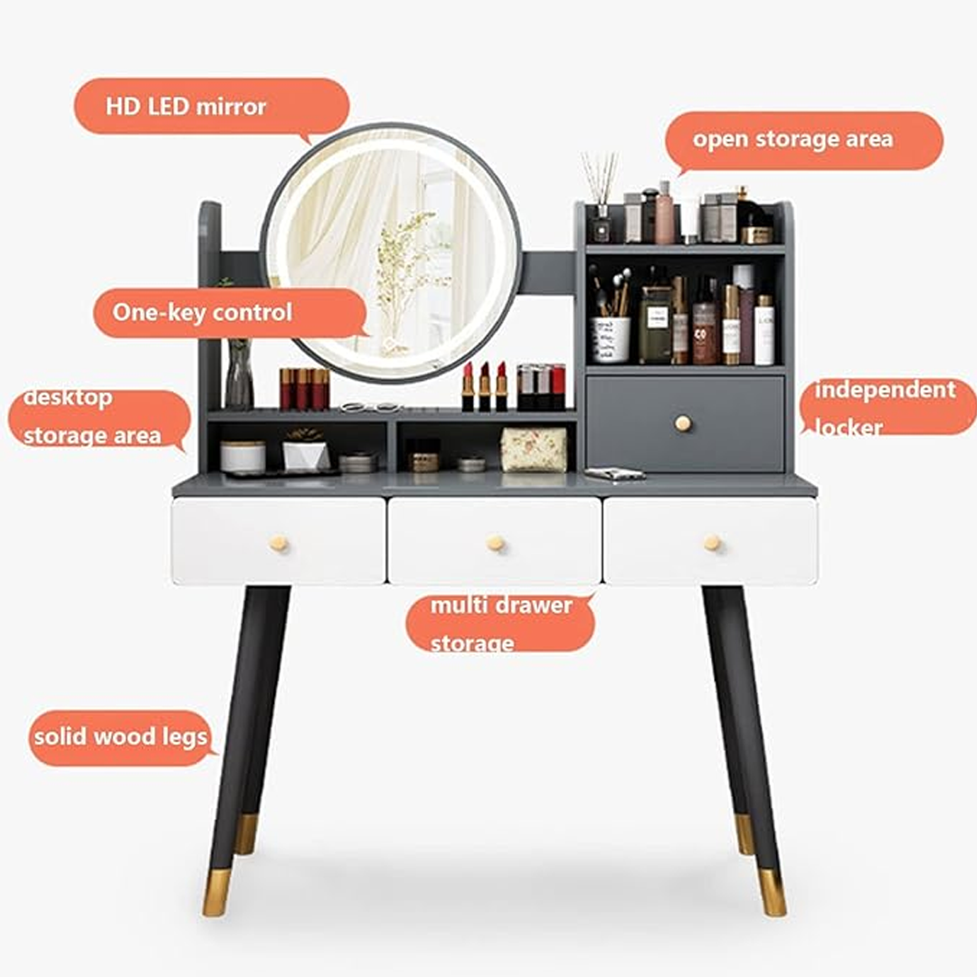 - Okos rendszerezés: Több fiók és rekesz biztosítja a sminkek, parfümök és más kellékek egyszerű tárolását.