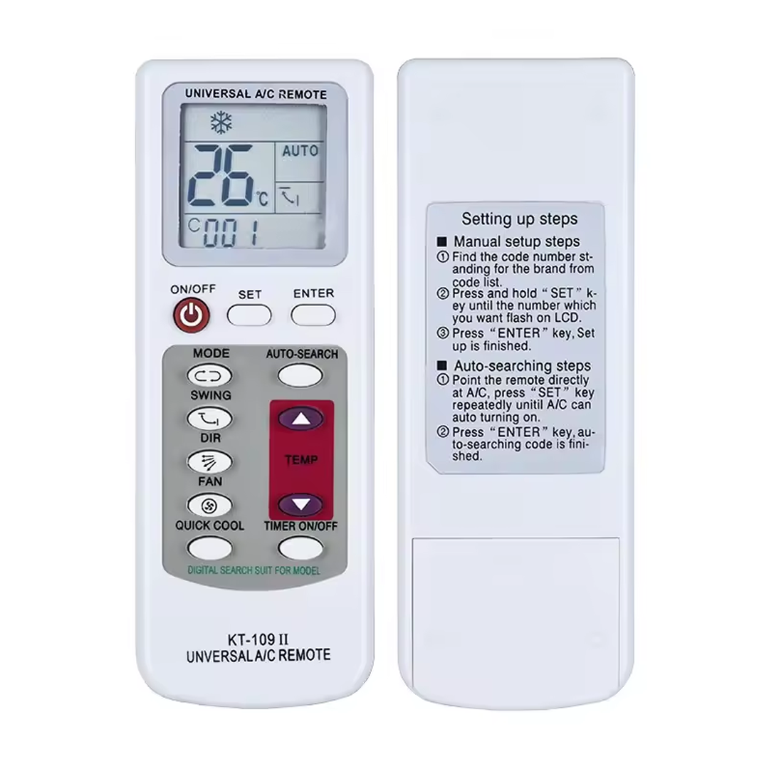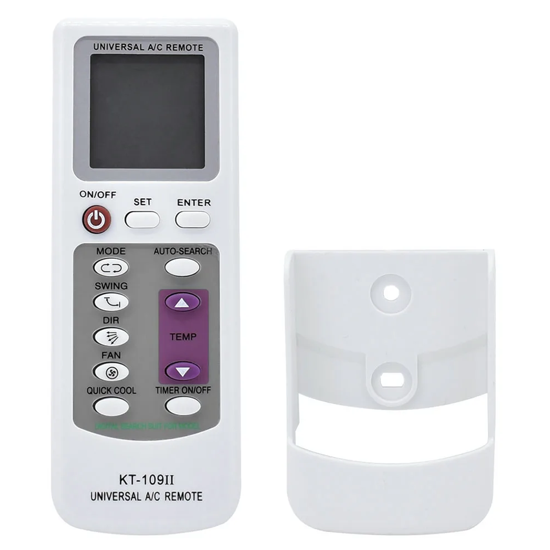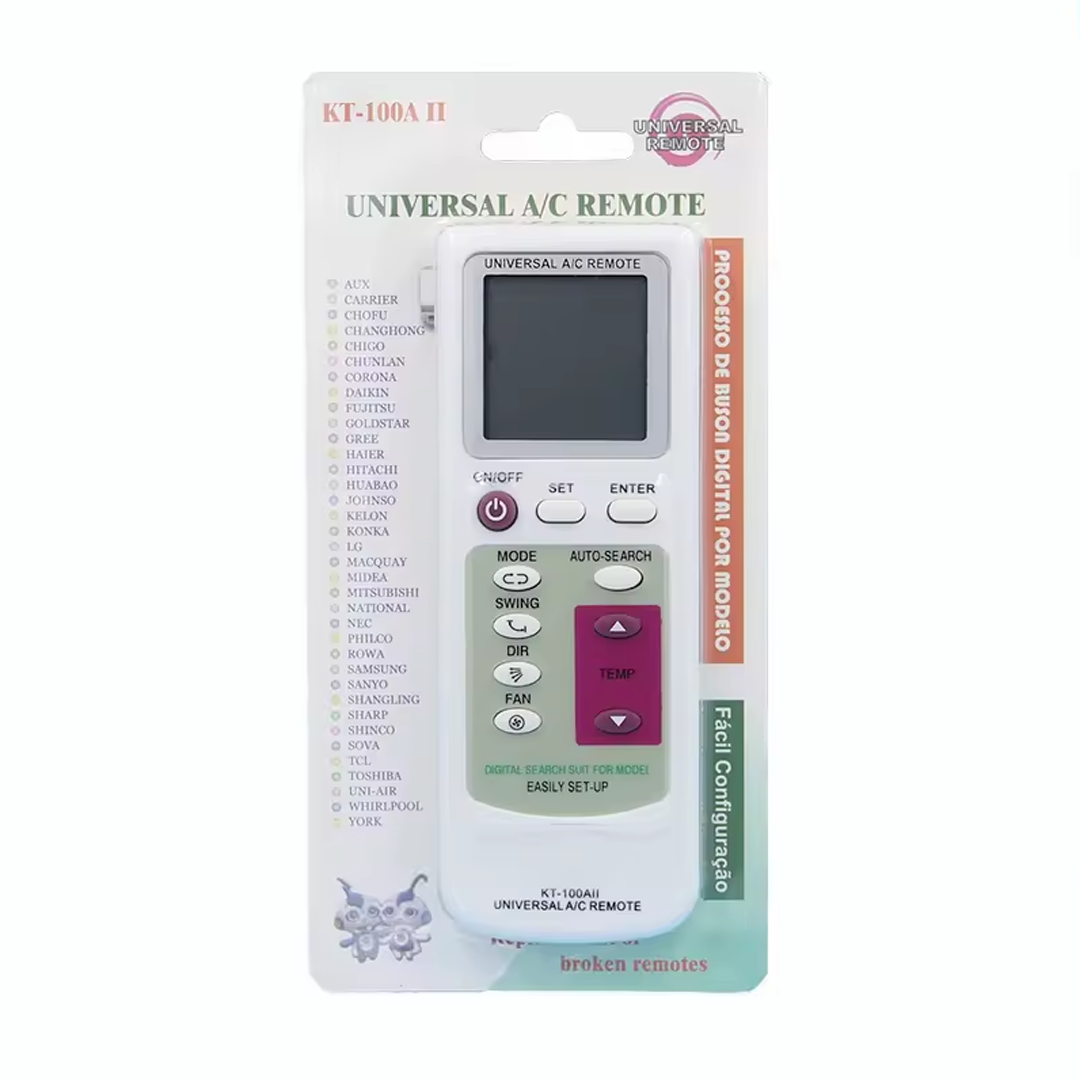 A klímaberendezések univerzális távirányítója több mint 1000 különféle légkondicionáló márkát támogat. Nagyon könnyű használni, és AAA akkumulátor patronokat használ (a csomagolásban nem szerepel). Fel van szerelve néző LCD képernyővel, óra és hőmérséklet mellett.