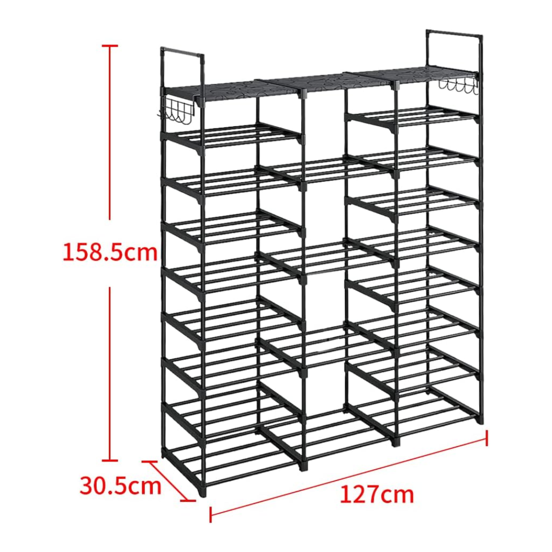 9 réteg, 3 oszlop – eltávolíthatja a szinteket, és magas csizmát vagy nagyobb cipőt tárolhat. Méretek: 127 × 30 × 58 cm.